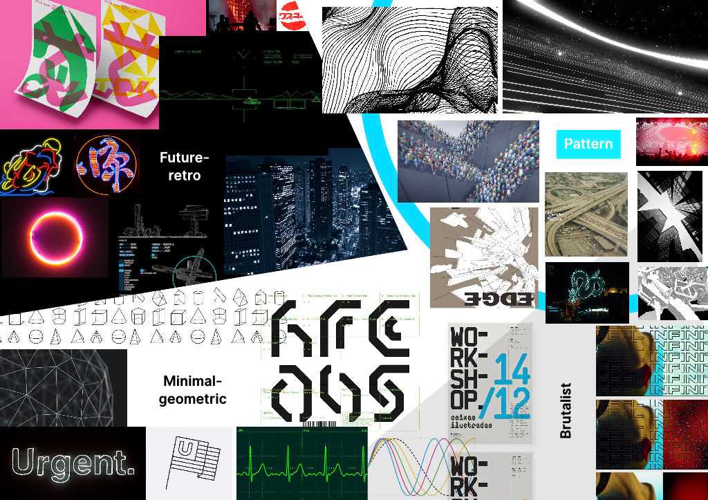 After going down various avenues I eventually settled on the idea of allowing the user to somehow visually remix a song using movement in VR. I felt this would allow exploration of the themes I started out with and also be feasible in the time we had for the project. I also settled on an audience (listeners of electronic music, design conscious aged 18-35) and hardware target (Oculus Go – the VR headset I had available at home). To appeal to the target market and to take into consideration the basic graphics capability of the Go I chose a minimal, geometric visual aesthetic. I always enjoy gathering and organising visual themes in moodboard format so that was my next task.