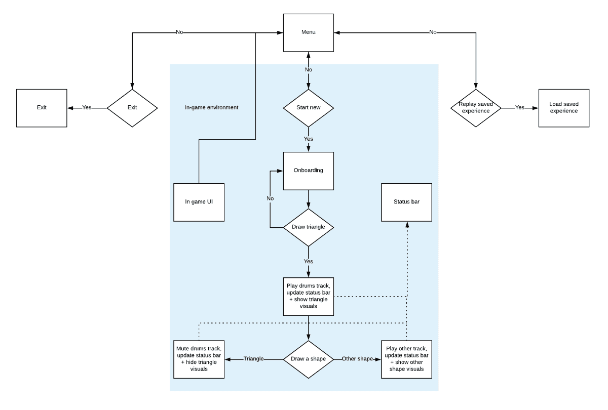 I came up with the idea of the mechanic being the user drawing shapes with the Go’s controller, which would be recognised by the Go as specific shapes. These shapes would then toggle audio tracks on/off. I didn’t have a clue how I would go about this but my tutors thought it was probably doable if I could get the shape recognition to work well.