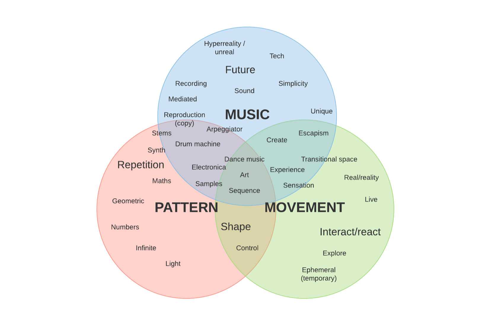 First-off I wrote out all the themes I was thinking of exploring, I then categorised them and reduced until I ended up with a Venn diagram consisting of headings “music”, “pattern” and “movement”, I often use this process to organise my thoughts. I used a Venn diagram as lots of the themes crossed-over and these intersections are often interesting places to explore.